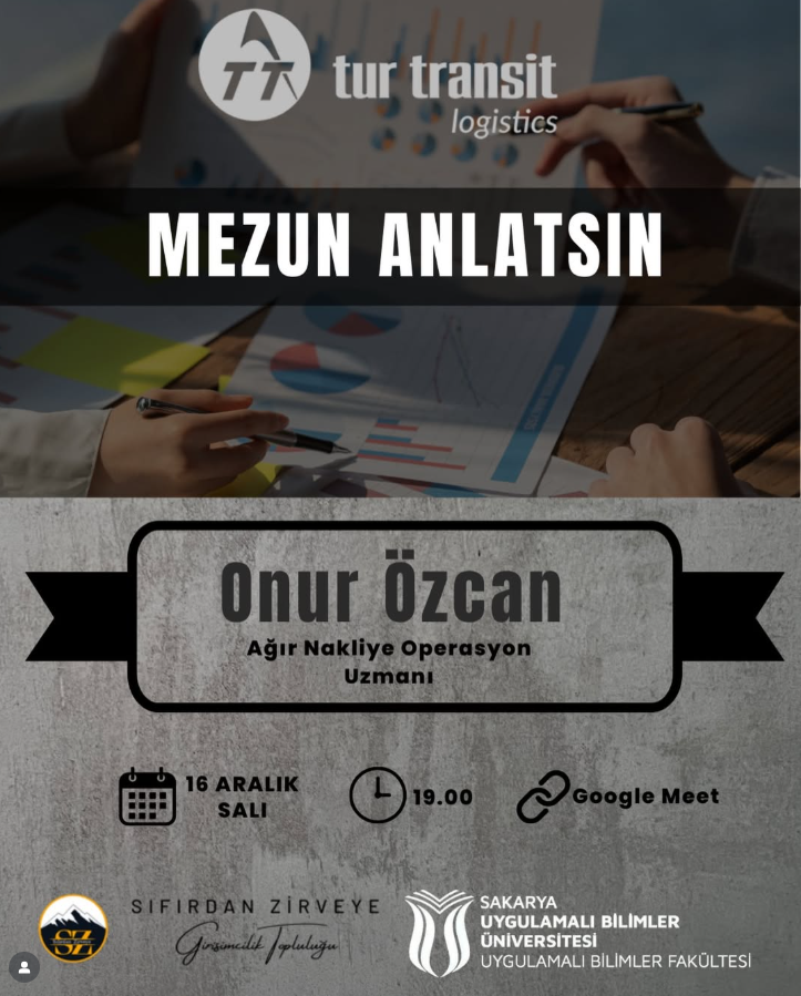 Sıfırdan Zirveye Girişimcilik Topluluğumuz tarafından düzenlenen etkinlik kapsamında, Sakarya Uygulamalı Bilimler Üniversitesi mezunlarımızdan, Tur Transit Logistics’te Ağır Nakliye Operasyon Uzmanı olarak görev yapan Onur Özcan bizlerle buluşuyor.