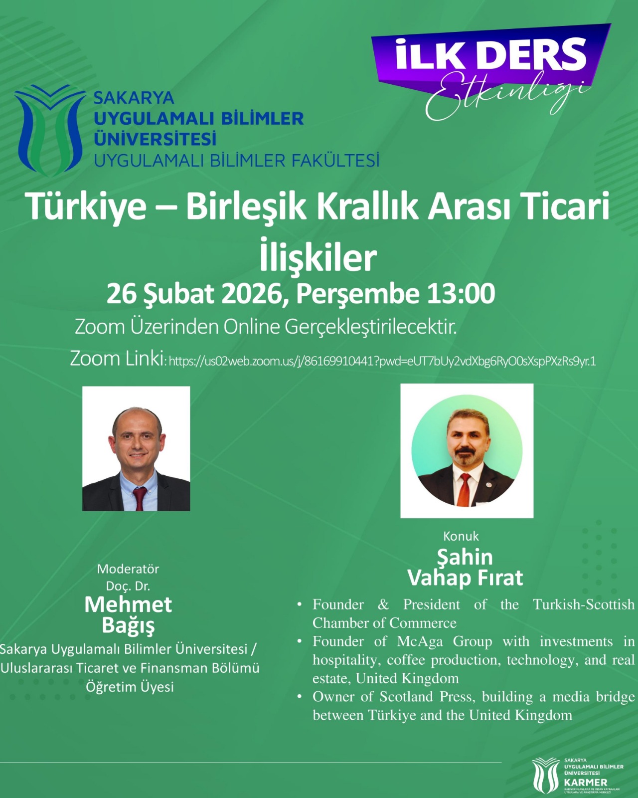 Türkiye ile İngiltere arasındaki ticari ilişkilerin güncel durumu, yatırım ve iş birliği fırsatları ile iki ülke arasındaki ekonomik perspektiflerin ele alınacağı bu etkinliğe tüm öğrencilerimiz ve akademik personelimiz davetlidir.