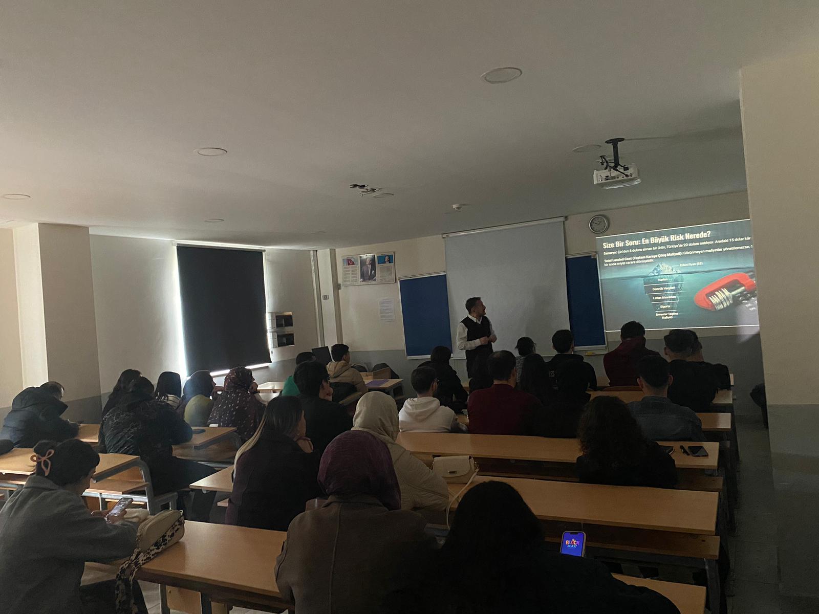 Gerçek sektör deneyimlerinden örnekler paylaşan Vodinalı, küresel pazarlarda rekabet edebilmenin yalnızca üretimle değil, doğru planlanmış ve etkin yönetilen lojistik süreçlerle mümkün olduğunu ifade etti. Öğrenciler, etkinlik boyunca yönelttikleri sorularla sürece aktif katılım sağladı.