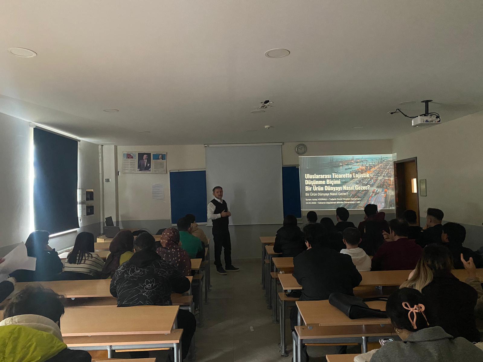 Fakültemiz tarafından düzenlenen İlk Ders Etkinliği kapsamında gerçekleştirilen Uluslararası Ticarette Lojistik Düşünme Biçimi: Bir Ürün Dünyayı Nasıl Gezer? başlıklı etkinlik, 24 Şubat 2026 Salı günü UBF B102 dersliğinde yoğun katılımla gerçekleştirildi.